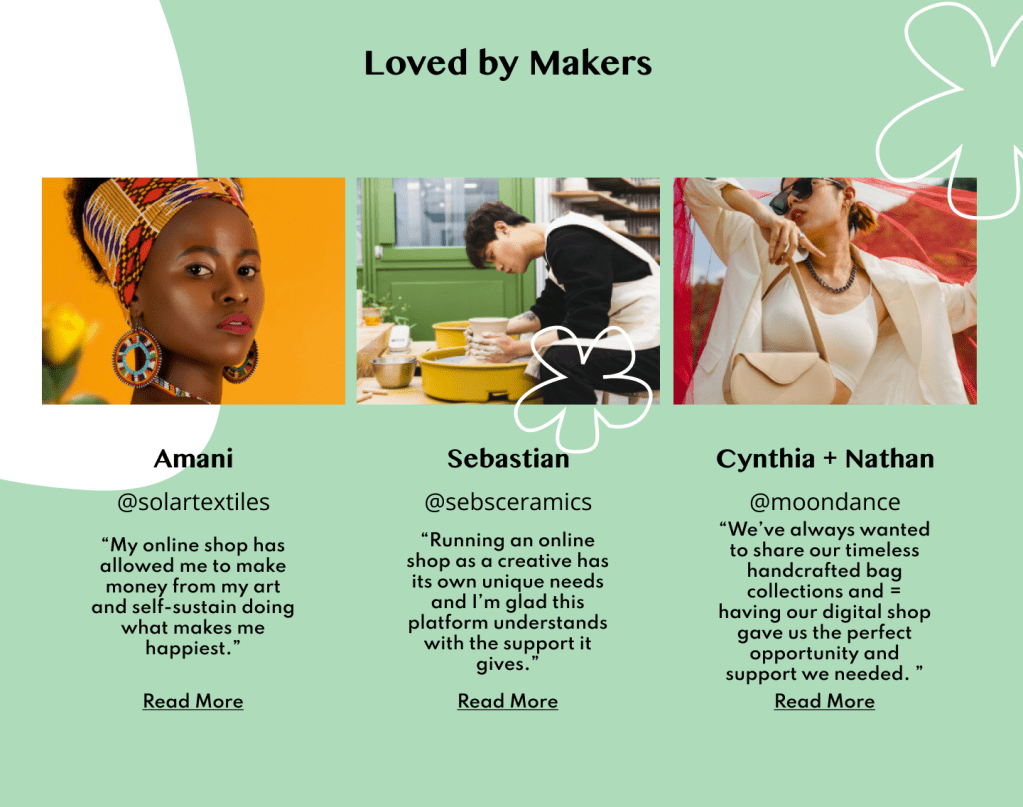 A section where target users can read testimonials of existing users benefitting from the platform. Also a space where the personal stories behind a user’s craft business is showcased to show Atelier’s alliance to hand-makers.